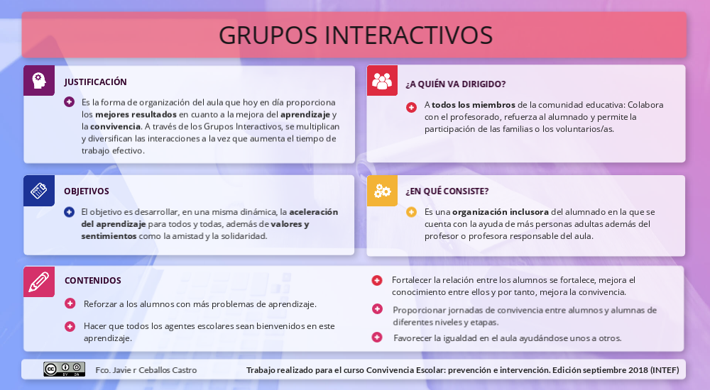 Es la forma de organización del aula que hoy en día proporciona los mejores resultados en cuanto a la mejora del aprendizaje y la convivencia. A través de los Grupos Interactivos, se multiplican y diversifican las interacciones a la vez que aumenta el tiempo de trabajo efectivo.