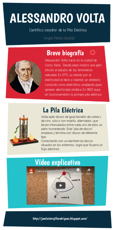 Alessandro Volta nació en la ciudad de Como, Italia. Desde joven mostró una gran afición al estudio de los fenómenos naturales. En 1775, su interés por la electricidad le llevó a inventar un artefacto conocido como electróforo, empleado para generar electricidad estática. En 1800 puso en funcionamiento la primera pila eléctrica.
