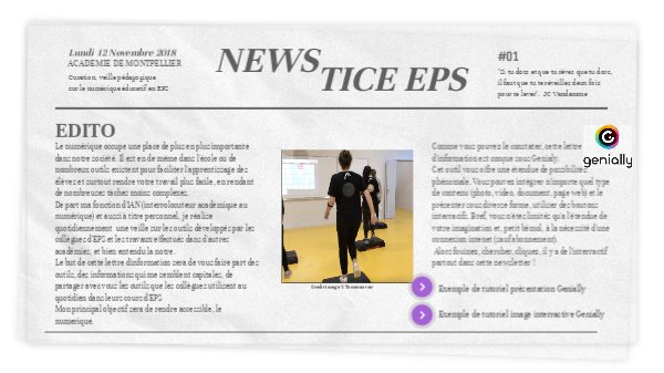 Comme vous pouvez le constater, cette lettre d'information est conçue sous Genialy. Cet outil vous offre une étendue de possibilités phénomale. Vous pouvez intégrer n'importe quel type de contenu (photo, video, document, page web) et le présenter sous diverse forme, utiliser des boutons interracifs. Bref, vous n'êtes limités qu'a l'étendue de votre imagination et, petit bémol, à la nécessité d'une connexion intenet (sauf abonnement). Alors fouinez, chercher, cliquez, il y a de l'interractif partout dans cette newsletter !
