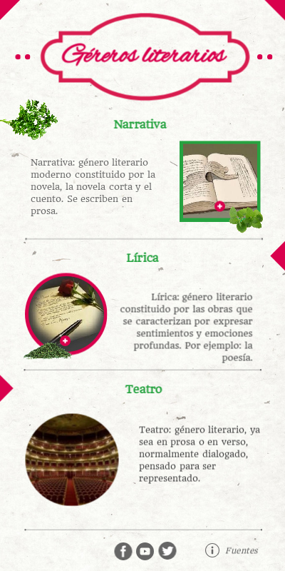 Narrativa: género literario moderno constituido por la novela, la novela corta y el cuento. Se escriben en prosa.