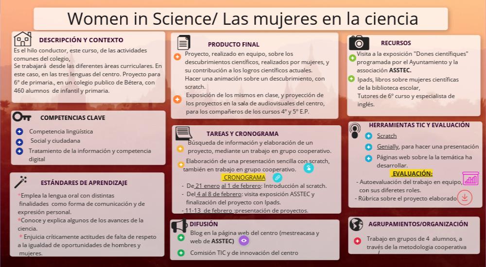 Proyecto, realizado en equipo, sobre los descubrimientos científicos, realizados por mujeres, y su contribución a los logros científicos actuales.Hacer una animación sobre un descubrimiento, con scratch.