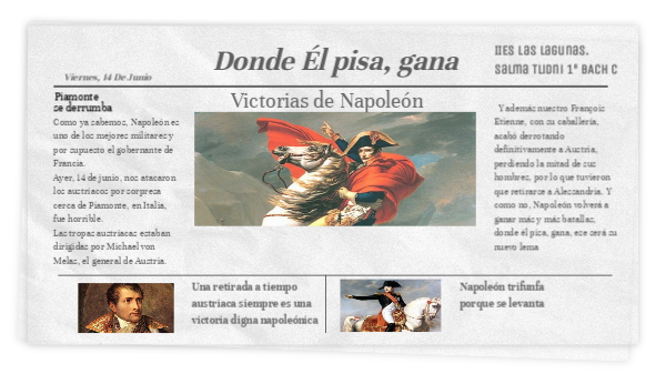 Ayer 14 de octubre de 1806, la tropas de Napoleón vencieron al ejército Prusiano que junto con la victoria de Auerstädt, sucedida ayer, derrotaron a Prusia. Hemos hablado con la esposa y los hijos de un militar francés que estuvo ayer en la batalla. Su hijo mayor nos dijo que Napoleón era muy grande y que estaba muy feliz por la victoria. La señora estaba eufórica al enterarse de que su esposo seguía vivo.