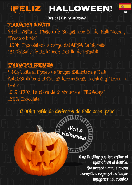EDUCACION INFANTIL9.45h: Visita al Museo de Brujas, cuento de Halloween y “Truco o trato”. 11.30h: Chocolatada a cargo del AMPA La Moraña. 12.00h Baile de Halloween (Pasillo de infantil) EDUCACION PRIMARIA 9.40h Visita al Museo de Brujas (Biblioteca y Hall) Aulas/Biblioteca: Historias terroríficas, cuentos y “Truco o trato”. 10’15-11’20h: La clase de 6º visitará el “IES Adaja”. 12’00: Chocolate