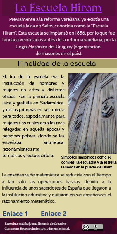 Previamente a la reforma vareliana, ya existía una escuela laica en Salto, conocida como la "Escuela Hiram". Esta escuela se implantó en 1856, por lo que fue fundada veinte años antes de la reforma vareliana, por la Logia Masónica del Uruguay (organización de masones en el país).