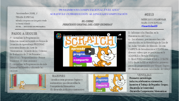 3.- Informar a las Familias en la Presentación del Curso .4.- Los alumnos previamente han sido introducidos en la Metodología de Uso de las Aulas Virtuales de Edmodo. Se crea CARPETA de Introducción a SCRATH con diversos vídeos que se proyectan en la ASAMBLEA (Tertulia Dialógica).5.- En el FORO se añade el link a SCRATH 3.0 y desde la PDI se explica los primeros pasos de programación por bloques lógicos. 6º.- Realizar sesiones tutorizadas de trabajo