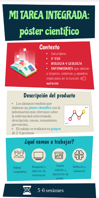 - Los alumnos tendrán que elaborar un póster científico con la información más relevante sobre la enfermedad seleccionada: descripción, causas, tratamiento, prevención...