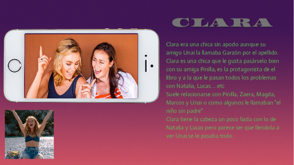 Clara era una chica sin apodo aunque su amigo Unai la llamaba Garzón por el apellido.Clara es una chica que le gusta pasárselo bien con su amiga Pinilla, es la protagonista de el libro y a la que le pasan todos los problemas con Natalia, Lucas.....etc Suele relacionarse con Pinilla, Zaera, Magda, Marcos y Unai o como algunos le llamaban "el niño sin padre" Clara tiene la cabeza un poco liada con lo de Natalia y Lucas pero parece ser que llendola a ver Unai se le pasaba todo.