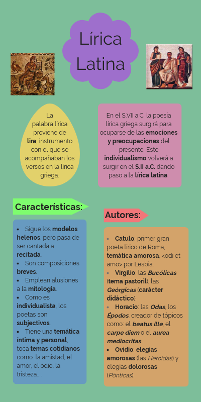 - Horacio: las Odas, los Épodos, creador de tópicos como: el beatus ille, el carpe diem o el aurea mediocritas.