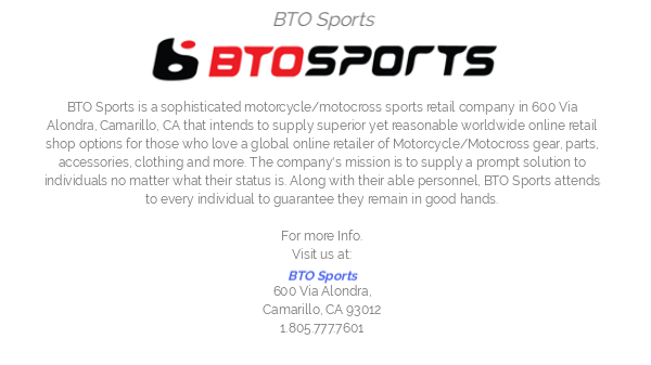 BTO Sports is a sophisticated motorcycle/motocross sports retail company in 600 Via Alondra, Camarillo, CA that intends to supply superior yet reasonable worldwide online retail shop options for those who love a global online retailer of Motorcycle/Motocross gear, parts, accessories, clothing and more. The company's mission is to supply a prompt solution to individuals no matter what their status is. Along with their able personnel, BTO Sports attends to every individual to guarantee they remain in good hands. For more Info. Visit us at: 600 Via Alondra, Camarillo, CA 93012 1.805.777.7601