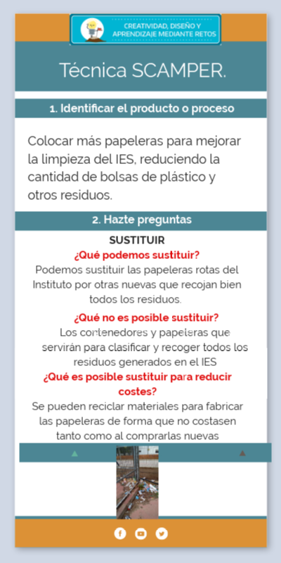 ¿Podemos combinar productos o partes de éstos? Podemos combinar las papeleras abiertas con los contenedores cerrados, y el tamaño de ellos, de forma que tengamos papeleras cerradas, sobre todo en los patios para que no se vuele su contenido y manche todo el recinto. ¿Qué podemos combinar con un elemento externo? Podemos combinar y modular varias papeleras de forma que consigamos tener un punto verde de recogida. Se puede visitar centros de reciclado de residuos y preguntar a los expertos cómo mejorar nuestro proyecto ¿Qué pasaría si combinamos estas características con un diseño que encaje en el espacio arquitectónico? Se pueden combinar papeleras rectangulares, semicirculares, cuadradas, que se adapten a esquinas, que tengan paredes asimétricas. Así se podrían cubrir todos los espacios del Instituto