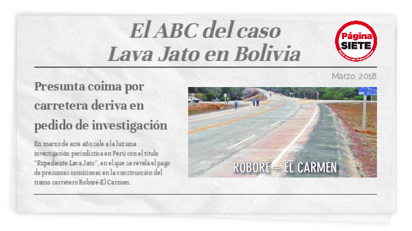 En marzo de este año sale a la luz una investigación periodística en Perú con el título “Expediente Lava Jato”, en el que se revela el pago de presuntas comisiones en la construcción del tramo carretero Roboré-El Carmen.