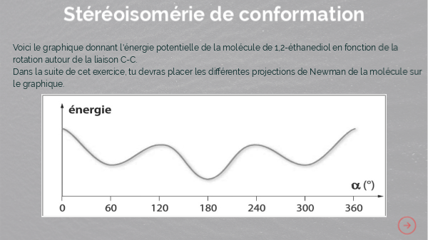 Voici le graphique donnant l'énergie potentielle de la molécule de 1,2-éthanediol en fonction de la rotation autour de la liaison C-C.Dans la suite de cet exercice, tu devras placer les différentes projections de Newman de la molécule sur le graphique.