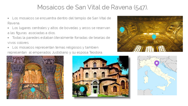 - Los mosaicos representan temas religiosos y tambien representan al emperados Justidiano y su esposa Teodora.