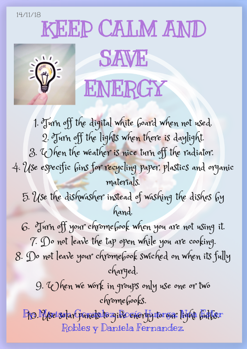1. Turn off the digital white board when not used.2. Turn off the lights when there is daylight. 3. When the weather is nice turn off the radiator. 4. Use especific bins for recycling paper, plastics and organic materials. 5. Use the dishwasher instead of washing the dishes by hand. 6. Turn off your chromebook when you are not using it. 7. Do not leave the tap open while you are cooking. 8. Do not leave your chromebook swiched on when its fully charged. 9. When we work in groups only use one or two chromebooks. 10. Use solar panels to give energy to our light bulbs.
