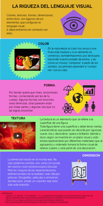 Colores, texturas, formas, dimensiones, entre otros, son algunos de los elementos que confguran ellenguaje visual. A diario entramos en contacto con ellos.