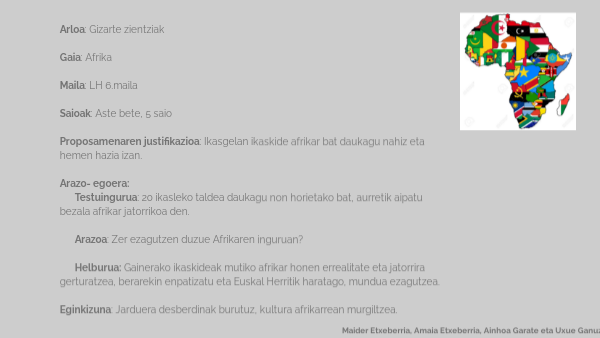 Arloa: Gizarte zientziakGaia: Afrika Maila: LH 6.maila Saioak: Aste bete, 5 saio Proposamenaren justifikazioa: Ikasgelan ikaskide afrikar bat daukagu nahiz eta hemen hazia izan. Arazo- egoera: Testuingurua: 20 ikasleko taldea daukagu non horietako bat, aurretik aipatu bezala afrikar jatorrikoa den. Arazoa: Zer ezagutzen duzue Afrikaren inguruan? Helburua: Gainerako ikaskideak mutiko afrikar honen errealitate eta jatorrira gerturatzea, berarekin enpatizatu eta Euskal Herritik haratago, mundua ezagutzea. Eginkizuna: Jarduera desberdinak burutuz, kultura afrikarrean murgiltzea.