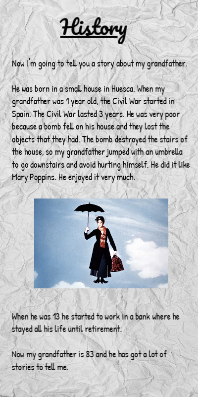 Now I'm going to tell you a story about my grandfather.He was born in a small house in Huesca. When my grandfather was 1 year old, the Civil War started in Spain. The Civil War lasted 3 years. He was very poor because a bomb fell on his house and they lost the objects that they had. The bomb destroyed the stairs of the house, so my grandfather jumped with an umbrella to go downstairs and avoid hurting himself. He did it like Mary Poppins. He enjoyed it very much. When he was 13 he started to work in a bank where he stayed all his life until retirement. Now my grandfather is 83 and he has got a lot of stories to tell me.