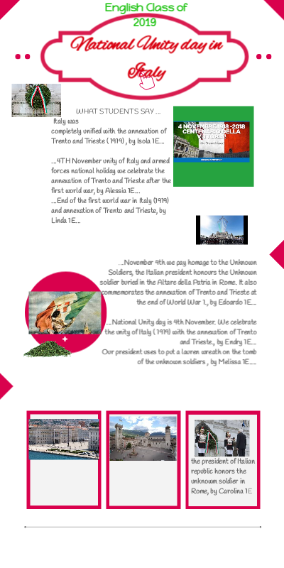 ...November 4th we pay homage to the Unknown Soldiers, the Italian president honours the Unknown soldier buried in the Altare della Patria in Rome. It also commemorates the annexation of Trento and Trieste at the end of World War 1., by Edoardo 1E......National Unity day is 4th November. We celebrate the unity of Italy ( 1919) with the annexation of Trento and Trieste., by Endry 1E... Our president uses to put a lauren wreath on the tomb of the unknown soldiers , by Melissa 1E....