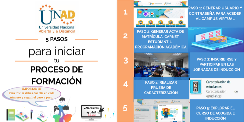 Para ingresar, sigue estos pasos: 1. Ingresa a www.unad.edu.co 2. Das clic en el extremo superior derecho en el enlace "acceso a campus virtual" 3. Digita el usuario y contraseña, que recibiste en el paso 2 4. Das clic en "mis cursos virtuales" 5. Accede al " Curso de acogida e Inducción Unadista" 6. Realiza el recorrido con la orientación del tour que aparece cuando ingresas al curso