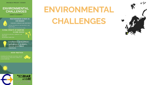 Spain is located in southwestern Europe in the Iberian Peninsula. The climate in Spain varies largely due to several geographical factors: the orographic, influence of the sea and the situation of the peninsula between Atlantic Ocean and Mediterranean Sea, with different temperature, and between two continents Europe and Africa. The five main climates are: Oceanic, Mediterranean (with some variations): Mediterranean coast and Mediterranean inland, Mountain and Subtropical. In this presentation we will focus on explaining the characteristics of the Inland Mediterranean climate since it is where we live.