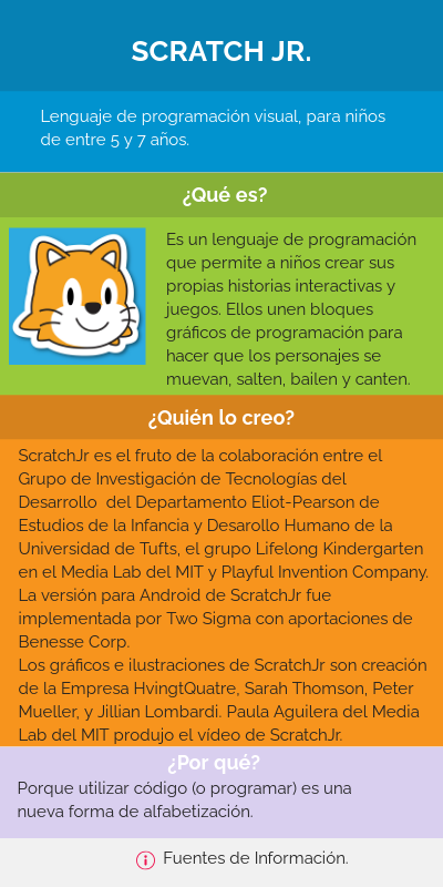 Es un lenguaje de programación que permite a niños crear sus propias historias interactivas y juegos. Ellos unen bloques gráficos de programación para hacer que los personajes se muevan, salten, bailen y canten.