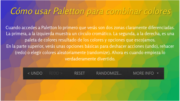 Cuando accedes a Paletton lo primero que verás son dos zonas claramente diferenciadas. La primera, a la izquierda muestra un círculo cromático. La segunda, a la derecha, es una paleta de colores resultado de los colores y opciones que escojamos. En la parte superior, verás unas opciones básicas para deshacer acciones (undo), rehacer (redo) o elegir colores aleatoriamente (randomize). Ahora es cuando empieza lo verdaderamente divertido.