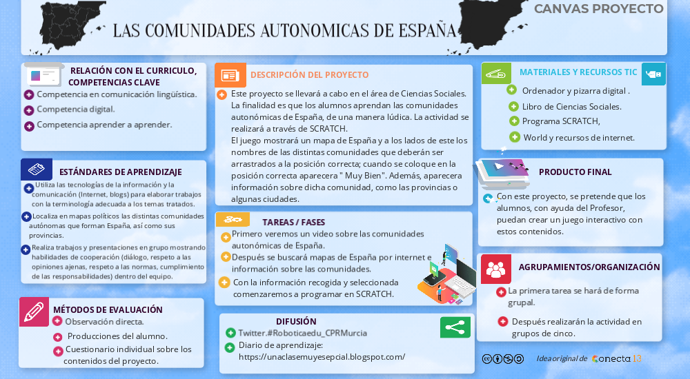Este proyecto se llevará a cabo en el área de Ciencias Sociales.La finalidad es que los alumnos aprendan las comunidades autonómicas de España, de una manera lúdica. La actividad se realizará a través de SCRATCH. El juego mostrará un mapa de España y a los lados de este los nombres de las distintas comunidades que deberán ser arrastrados a la posición correcta; cuando se coloque en la posición correcta aparecera " Muy Bien". Además, aparecera información sobre dicha comunidad, como las provincias o algunas ciudades.