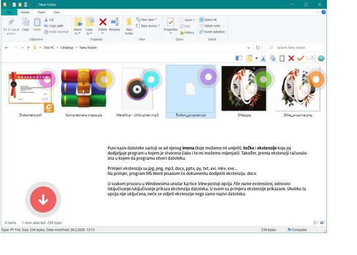 Puni naziv datoteke sastoji se od njenog imena (koje možemo mi unijeti), točke i ekstenzije koju joj dodijeljuje program u kojem je stvorena (iako i to mi možemo mijenjati). Također, prema ekstenziji računalo zna u kojem da programu otvori datoteku. Primjeri ekstenzija su jpg, png, mp3, docx, pptx, py, txt, avi, mkv, exe... Na primjer, program MS Word pisanom će dokumentu dodijeliti ekstenziju .docx. U svakom prozoru u Windowsima unutar kartice View postoji opcija File name extensions, odnosno isključivanje/uključivanje prikaza ekstenzija datoteka. U ovom su primjeru ekstenzije prikazane. Ukoliko ta opcija nije uključena, neće se vidjeti ekstenzije nego samo nazivi datoteka.