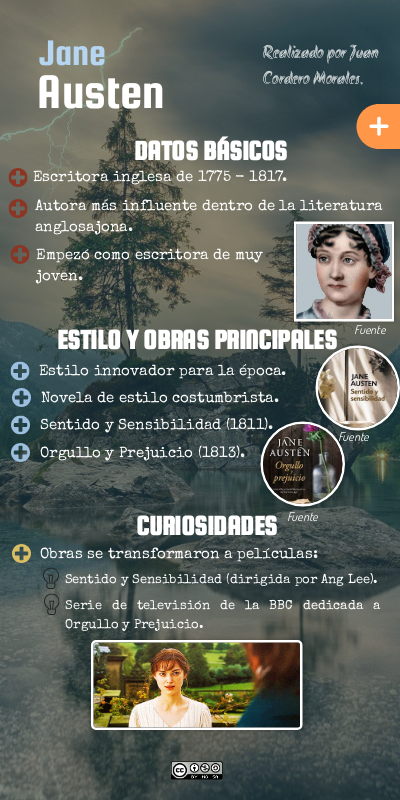 Es una escritora de Steventon (Inglaterra) en 1775 y murió en 1817 en Winchester (Inglaterra). Considerada como una de las autoras más influentes dentro de la literatura anglosajona. Empezó como escritora de muy joven, escribiendo de niña varias obras que serían compiladas años después de su muerte. Sentido y Sensibilidad (1811) fue la primera obra que publicó; consiguió con esto algo de fama. Orgullo y Prejuicio (1813) la publicó dos años más tarde, y es una de sus obras más famosas. Su estilo es muy innovador en su época, y su novela, de estilo costumbrista, fue muy popular y consiguió influir de manera notable a generaciones posteriores de escritores ingleses. Sus últimas novelas fueron Persuasión y La abadía de Northanger y se publicaron cuando ella ya había fallecido. Muchas de sus obras se transformaron a películas, destacando Sentido y Sensibilidad (dirigida por Ang Lee) y la serie de televisión de la BBC dedicada a Orgullo y Prejuicio.