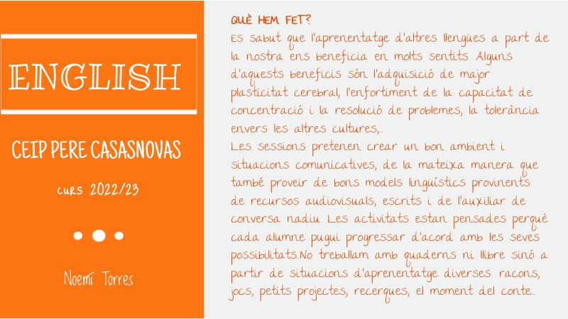 QUÈ HEM FET? Es sabut que l'aprenentatge d'altres llengües a part de la nostra ens beneficia en molts sentits. Alguns d'aquests beneficis són l'adquisició de major plasticitat cerebral, l'enfortiment de la capacitat de concentració i la resolució de problemes, la tolerància envers les altres cultures,... Les sessions pretenen crear un bon ambient i situacions comunicatives, de la mateixa manera que també proveir de bons models lingüístics provinents de recursos audiovisuals, escrits i de l'auxiliar de conversa nadiu. Les activitats estan pensades perquè cada alumne pugui progressar d'acord amb les seves possibilitats...No treballam amb quaderns ni llibre sinó a partir de situacions d'aprenentatge diverses: racons, jocs, petits projectes, recerques, el moment del conte....