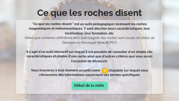 "Ce que les roches disent " est un outil pédagogique recensant les roches magmatiques et métamorphiques. Y sont décrites leurs caractéristiques, leur localisation, leur formation, etc. Notez que certaines définitions ainsi que l'origine des roches sont issues de l'Atlas de Géologie et Pétrologie (livre BCPST). Il s'agit d'un outil interactif sur lequel il est possible de consulter d'un simple clic caractéristiques et photos d'une roche ainsi que d'autres critères que vous aurez l'occasion de découvrir. Vous trouverez à tout moment un petit icone cliquable sur lequel vous retrouverez des informations concernant des termes spécifiques