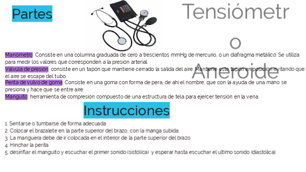 Manómetro: Consiste en una columna graduada de cero a trescientos mmHg de mercurio, o un diafragma metálico. Se utiliza para medir los valores que corresponden a la presión arterial