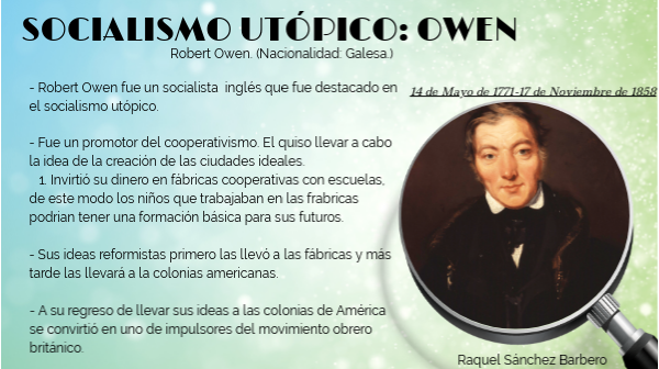 - Robert Owen fue un socialista inglés que fue destacado en el socialismo utópico. - Fue un promotor del cooperativismo. El quiso llevar a cabo la idea de la creación de las ciudades ideales. 1. Invirtió su dinero en fábricas cooperativas con escuelas, de este modo los niños que trabajaban en las frabricas podrian tener una formación básica para sus futuros. - Sus ideas reformistas primero las llevó a las fábricas y más tarde las llevará a la colonias americanas. - A su regreso de llevar sus ideas a las colonias de América se convirtió en uno de impulsores del movimiento obrero británico.