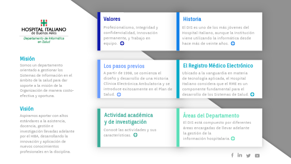 El Departamento de Informática en Salud es uno de los más jóvenes del Hospital Italiano, aunque la Institución viene utilizando la informática desde hace más de veinte años. Creado en 2001, pasó a integrar en forma multidisciplinaria y bajo su conducción a todos los grupos de sistemas, tecnologías y medios informáticos existentes. Como en la mayoría de los hospitales de los países desarrollados, la historia comenzó hace unas dos décadas con la informatización de los procesos administrativos, tras lo cual, y muy rápidamente, se informatizaron las fichas médicas dedicadas a la investigación clínica. El Departamento de Docencia e Investigación fue uno de los pioneros en este sentido, creando un comité responsable de difundir el conocimiento acumulado y un área de iconografía médica. Iniciativas a las que siguieron a lo largo de los años la informatización de la Biblioteca y de sus servicios. De allí en adelante muchos fueron los Servicios que desde distintas perspectivas y con diferentes necesidades invirtieron en la formación de recursos humanos y tecnología informática. El Hospital, a su vez, hizo enormes esfuerzos organizacionales y económicos para actualizar y ampliar sus sistemas de administración y gestión e integrar los desarrollos informáticos de los distintos sectores. Estos desarrollos alcanzaron una gran variedad de perspectivas (administrativas, control de gestión, registro de fichas, investigación clínica, herramientas pedagógicas, gestión operativa e incluso algunos proyectos asistenciales orientados a la especialidad), de vocabularios y de plataformas.