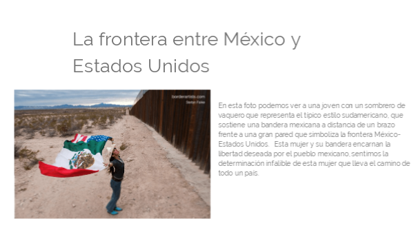 En esta foto podemos ver a una joven con un sombrero de vaquero que representa el típico estilo sudamericano, que sostiene una bandera mexicana a distancia de un brazo frente a una gran pared que simboliza la frontera México-Estados Unidos. Esta mujer y su bandera encarnan la libertad deseada por el pueblo mexicano, sentimos la determinación infalible de esta mujer que lleva el camino de todo un país.