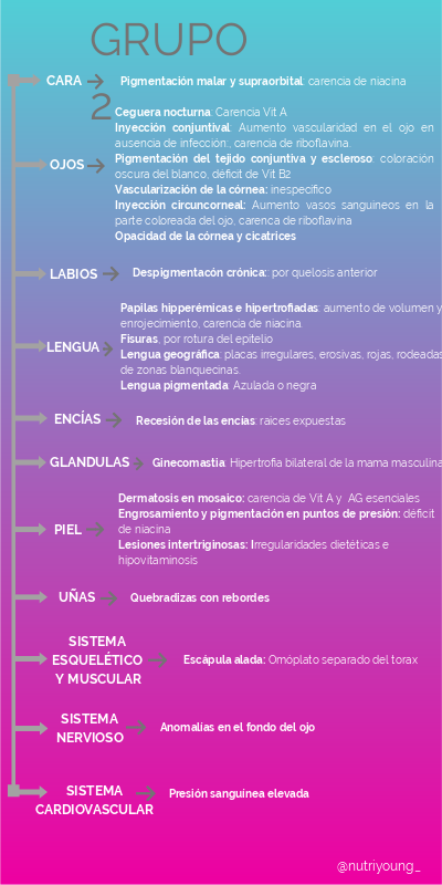 Ceguera nocturna: Carencia Vit A Inyección conjuntival: Aumento vascularidad en el ojo en ausencia de infección:, carencia de riboflavina. Pigmentación del tejido conjuntiva y escleroso: coloración oscura del blanco, déficit de Vit B2 Vascularización de la córnea: inespecífico Inyección circuncorneal: Aumento vasos sanguineos en la parte coloreada del ojo, carenca de riboflavina Opacidad de la córnea y cicatrices