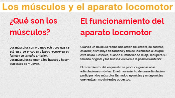 Los músculos son órganos elásticos que se estiran y se encogen y luego recuperan su forma y su tamaño anterior.Los músculos se unen a los huesos y hacen que estos se muevan.
