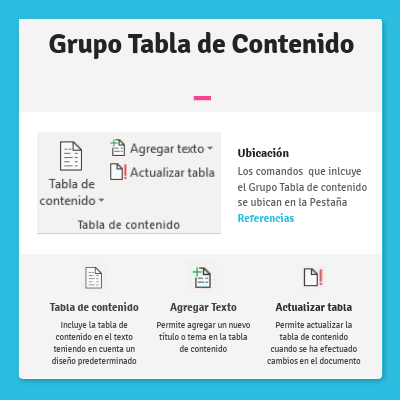 Los comandos que inlcuye el Grupo Tabla de contenido se ubican en la Pestaña Referencias