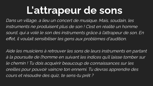 Dans un village, a lieu un concert de musique. Mais, soudain, les instruments ne produisent plus de son ! C’est en réalité un homme sourd, qui a volé le son des instruments grâce à l’attrapeur de son. En effet, il voulait sensibiliser les gens aux problèmes d'audition. Aide les musiciens à retrouver les sons de leurs instruments en partant à la poursuite de l’homme en suivant les indices qu’il laisse tomber sur le chemin ! Tu dois acquérir beaucoup de connaissances sur les oreilles pour pouvoir vaincre ton ennemi. Tu devras apprendre des cours et résoudre des quiz, te sens-tu prêt ?