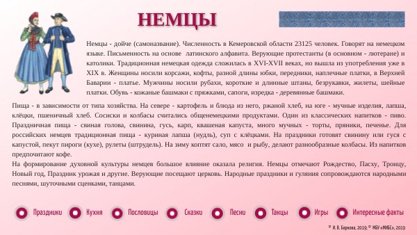 Немцы - дойче (самоназвание). Численность в Кемеровской области 23125 человек. Говорят на немецком языке. Письменность на основе латинского алфавита. Верующие протестанты (в основном - лютеране) и католики. Традиционная немецкая одежда сложилась в XVI-XVII веках, но вышла из употребления уже в XIX в. Женщины носили корсажи, кофты, разной длины юбки, передники, наплечные платки, в Верхней Баварии - платье. Мужчины носили рубахи, короткие и длинные штаны, безрукавки, жилеты, шейные платки. Обувь - кожаные башмаки с пряжками, сапоги, изредка - деревянные башмаки.