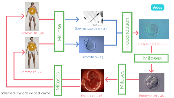 Au cours de la fécondation, un gamète mâle et un gamète femelle s'unissent : leur fusion conduit à un zygote (cellule oeuf).