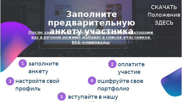 После заполнения анкеты и проверки модераторами вас в ручном режиме добавят в список участников ВЕБ-олимпиады