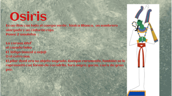 Es un dios con todo el cuerpo verde , túnica Blanca, un sombrero alargado y un cinturón rojo.Posee 2 amuletos : La corona Atef el cayado heka El látigo (mayal o nejej) O el cetro uas. El pilar dyed era su objeto sagrado. Aunque raramente, también se le representó con forma de cocodrilo, toro negro, garza, can o de gran pez.
