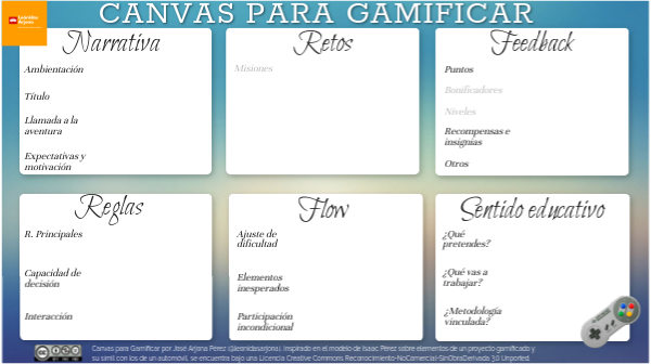 Canvas para Gamificar por José Arjona Pérez (@leonidasarjona), inspirado en el modelo de Isaac Pérez sobre elementos de un proyecto gamificado y su símil con los de un automóvil, se encuentra bajo una Licencia Creative Commons Reconocimiento-NoComercial-SinObraDerivada 3.0 Unported.