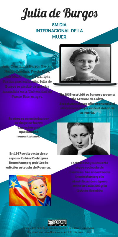 Julia Constancia Burgos García; Nació: Carolina, Puerto Rico, 1914 Murió: Nueva York, 1953Poetisa puertorriqueña. Julia de Burgos se graduó de maestra normalista en la Universidad de Puerto Rico en 1933.