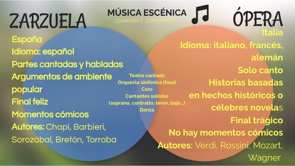 EspañaIdioma: español Partes cantadas y habladas Argumentos de ambiente popular Final feliz Momentos cómicos Autores: Chapí, Barbieri, Sorozábal, Bretón, Torroba