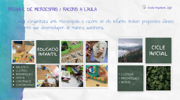 L'aula s'organitaza amb microespais o racons on els infants troben propostes d'àrees diferents que desenvolupen de manera autònoma.