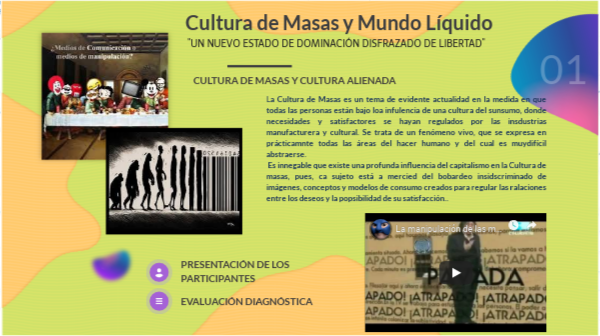 Instrucciones:Con base a las siguientes preguntas, elabora un comentario personal en el foro inicial sobre Cultura de Masas y comenta al menos a un compañero. 1 ¿Para ti qué es la cultura de masas? 2 ¿Qué diferencia encuentras entre cultura de masas y sociedad de masas? 3 ¿Qué papel juegan los medios masivos de comunicación para la cm. 4 ¿Podrías establecer ventajas y desventajas del uso de los medios masivos? 5 ¿Puedes establecer beneficios y perjuicios derivados de la c de m? 6 ¿Podrías dar un ejemplo de la sociedad sólida a la sociedad líquida? 7 ¿Hacia dónde consideras que tienden las sociedades contemporáneas?