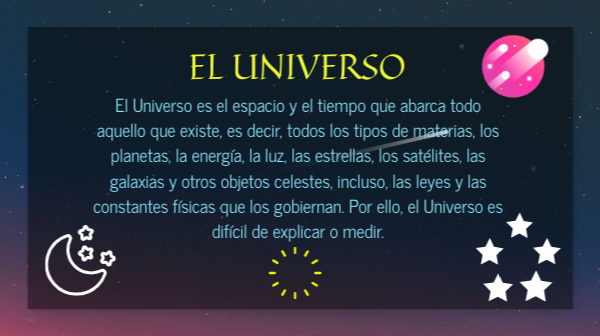 El Universo es el espacio y el tiempo que abarca todo aquello que existe, es decir, todos los tipos de materias, los planetas, la energía, la luz, las estrellas, los satélites, las galaxias y otros objetos celestes, incluso, las leyes y las constantes físicas que los gobiernan. Por ello, el Universo es difícil de explicar o medir.