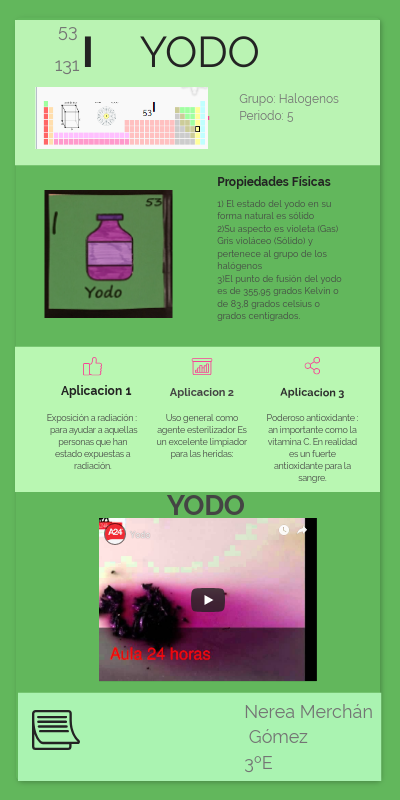 1) El estado del yodo en su forma natural es sólido2)Su aspecto es violeta (Gas) Gris violáceo (Sólido) y pertenece al grupo de los halógenos 3)El punto de fusión del yodo es de 355,95 grados Kelvin o de 83,8 grados celsius o grados centígrados.